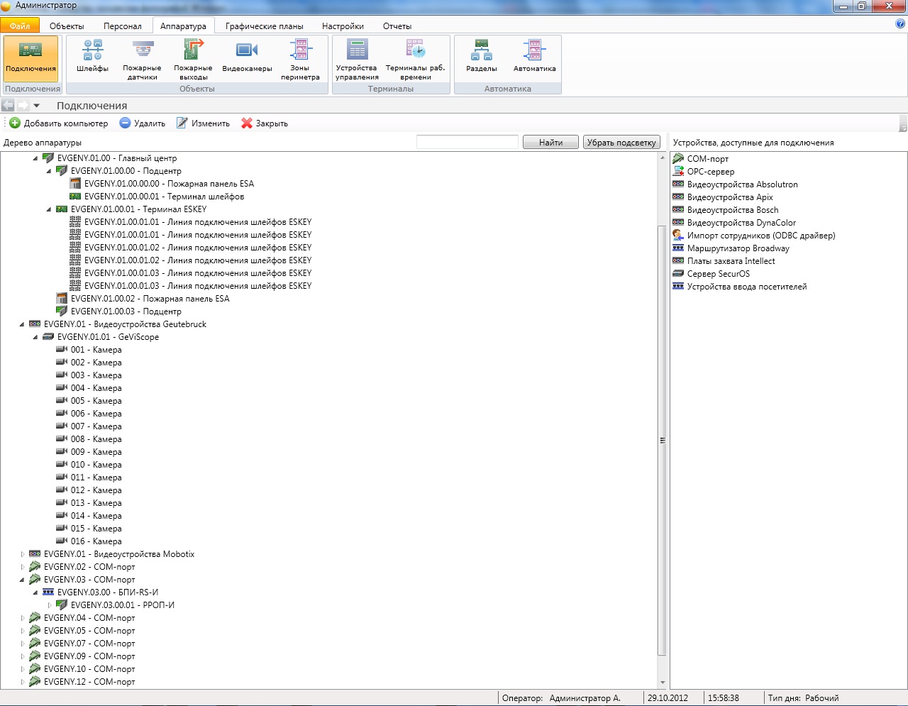 Программный модуль «Администратор» является обязательным компонентом ПО «ESELTA». Программа предназначена для конфигурирования всех систем комплекса. В данном программном модуле выполняется ввод данных о структуре оборудования, определяется структура помещений и дверей, назначаются права на доступ в помещения, назначаются права на снятие и постановку помещений под охрану, назначаются права сотрудникам на запуск приложений и многое другое.